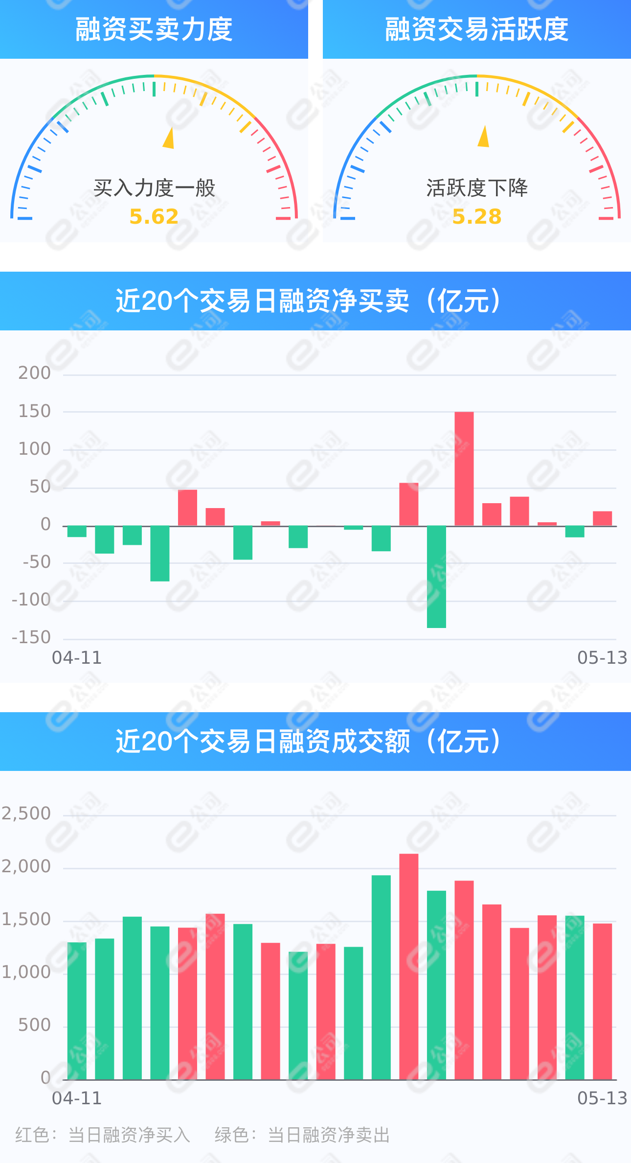 截至5月13日,上交所融资余额报7923.63亿元,较前一交易日增加15.34亿元;深交所融资余额报7030.42亿元,较前一交易日增加3.58亿元;两市合计14954.05亿元,较前一交易日增加18.92亿元,融资交易额1473.08亿元,占A股成交额16.19%,其中融资买入额746.00亿元,融资偿还额727.08亿元,交易活跃度下降4.84%。