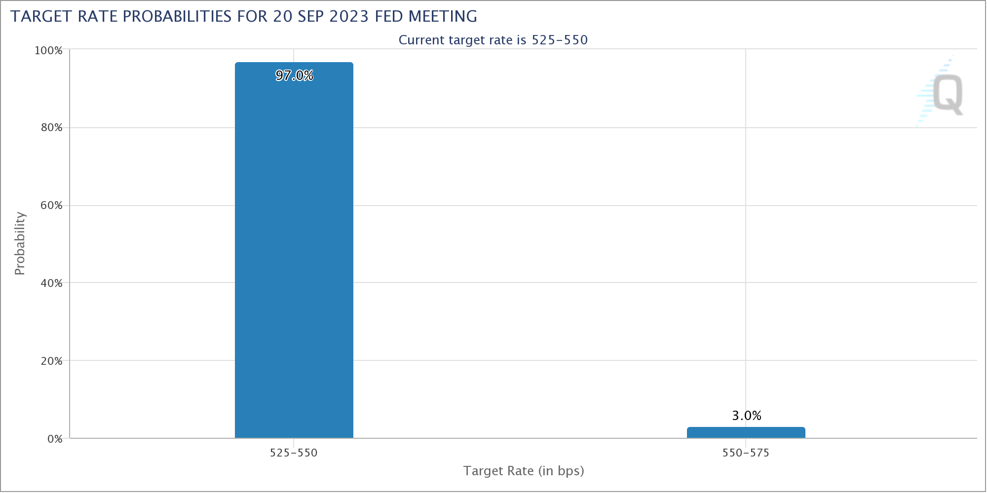 核心通胀下降趋势与衍生品市场交易商上调 9 月份加息暂停的预期同时发生。值得注意的是,美联储9月19日至20日会议的目标利率概率已从一周前的93%跃升至97%。