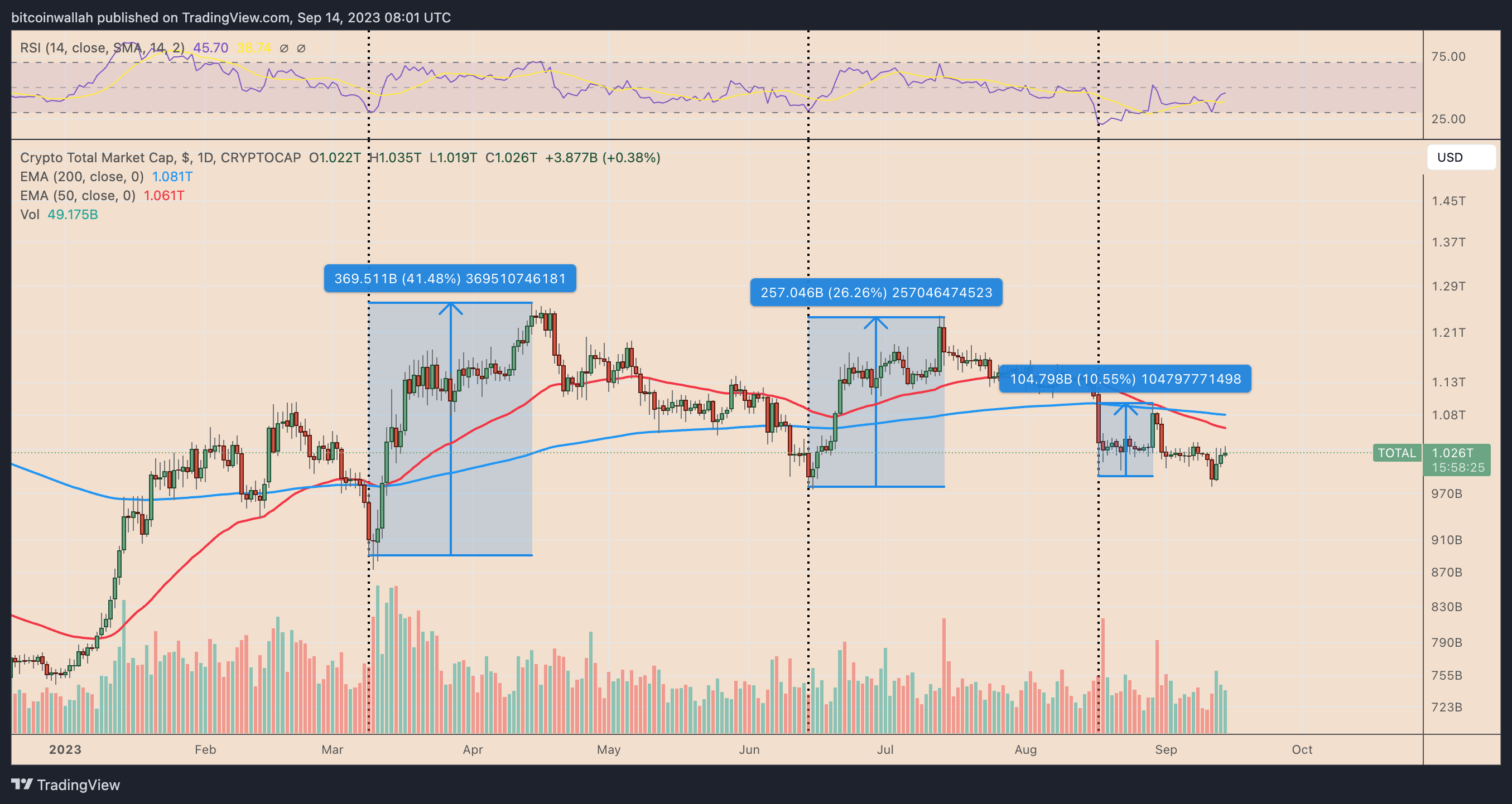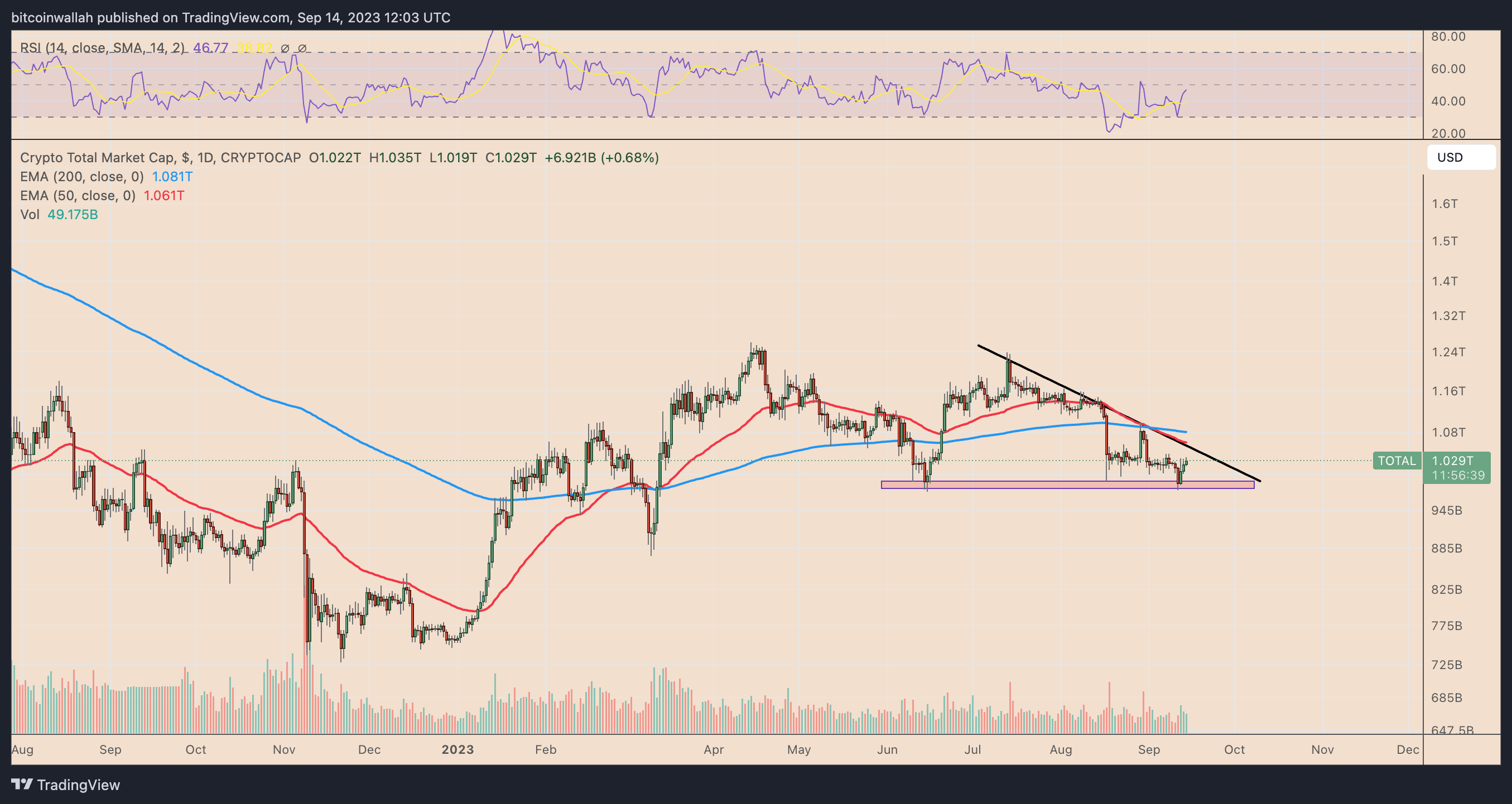 另一方面,在测试趋势线与 EMA 汇合之前或之后的回调可能会使加密货币市场估值在第四季度跌至 980-9950 亿美元范围(红色区域)。