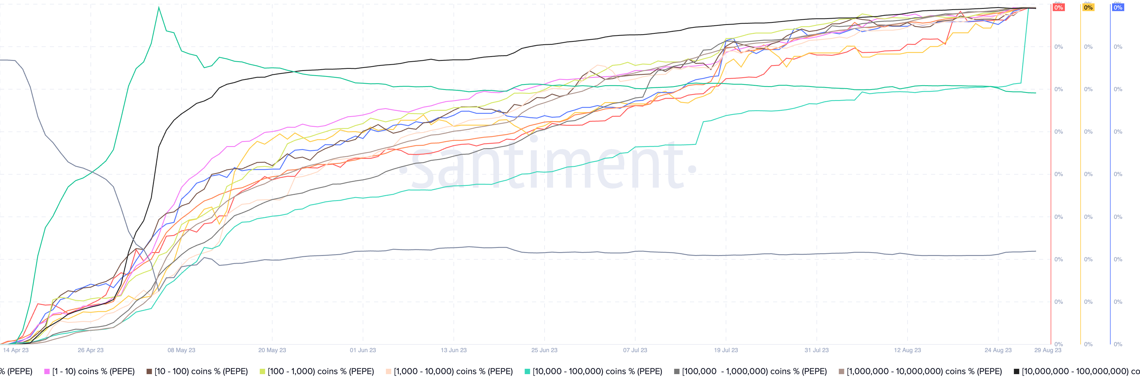 乐观的一面是,一些 PEPE 投资者利用代币价格下跌作为逢低买入的机会。值得注意的是,自 8 月 27 日以来,余额在 10,000 至 100,000 个 PEPE 代币之间的实体持有的供应量大幅增加。