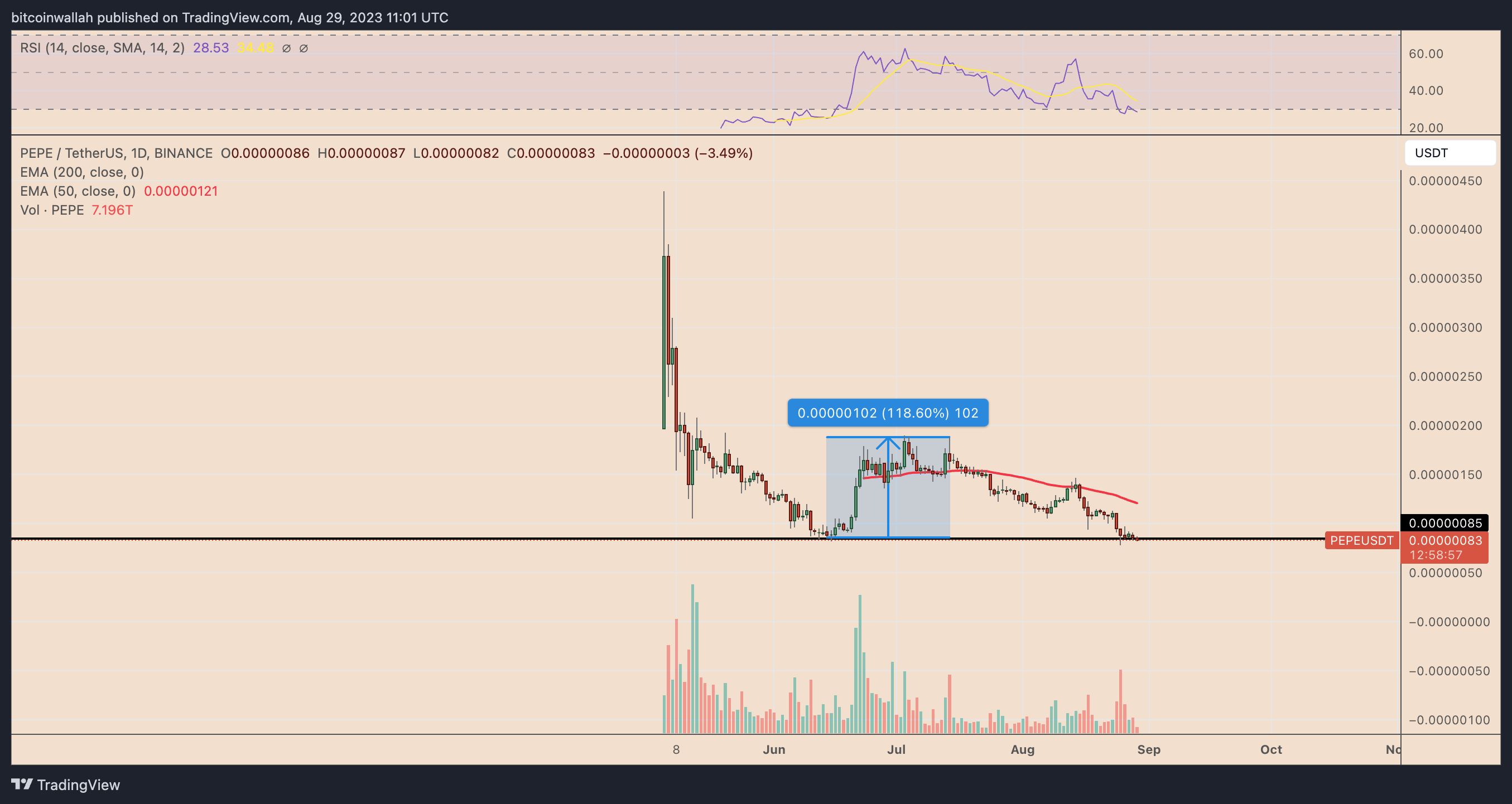 从技术上讲,PEPE 一直在 0.00000085 美元左右的公认积累区域附近交易,该区域在 2023 年 6 月至 7 月期间价格上涨了 120%。因此,考虑到 PEPE 的超卖相对强弱指数 (RSI),市场在此水平反弹的可能性很高。