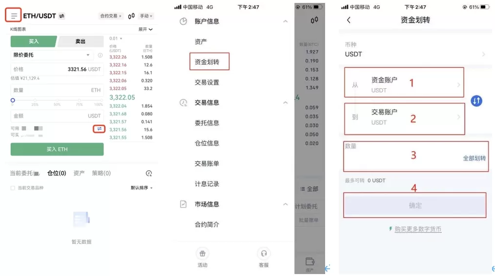 【交易】页面进行资金划转:打开欧易APP,在交易页面点击进入某币种(如ETH)页面,选择可用金额后的划转图标,或点击左上角更多标识,从【资金账户】—到【交易账户】—输入划转【数量】—【确定】。