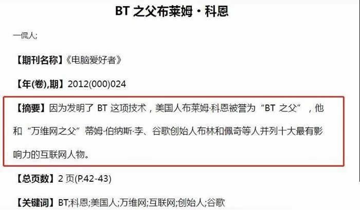 因为发明了BT这项技术,布莱姆-科恩被誉为“BT之父”,和“万维网之父”蒂姆-伯纳斯-李、谷歌创始人布林和佩奇等人并列十大最有影响力的互联网人物。