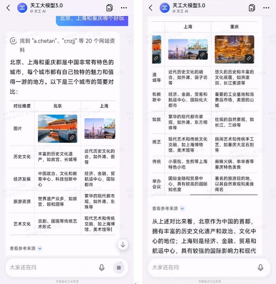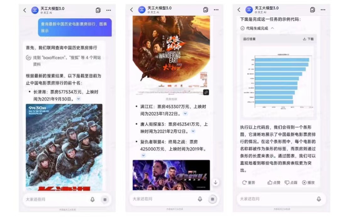 图表绘制:「天工3.0」全面提高了逻辑推理能力与用户自然语言Query的理解能力,使其能够更精准地判断用户需求,独立生成并调用代码,结合文本需求实时进行内容分析及图表构建,为用户带来更直观、高效的对比结果。