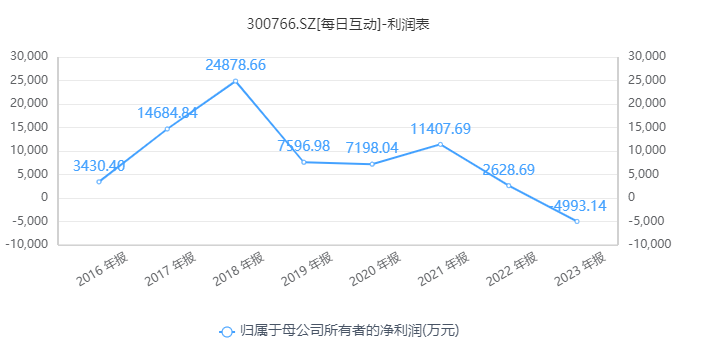 然而,2019年3月上市后,每日互动经营业绩急速变脸。上市当年公司实现归母净利润7596.98万元,同比减少69.46%。此后三年,其归母净利润增速分别为-5.25%、58.48%和-76.96%,2023年归母净利润同比盈转亏,亏损4996.14万元,当期利润增速同比大降289.95%。