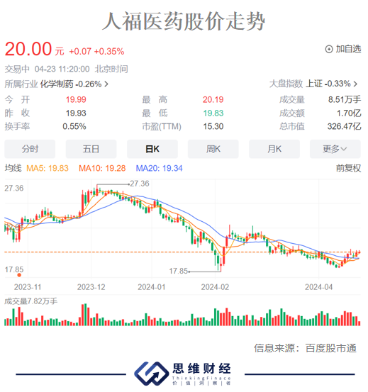 二级市场方面,人福医药近三年多来股价在波动中下滑,今年年初创阶段性新低至17.85元/股,相比2020年年中39元/股的高点大幅降低。近期股价有所回升,截至4月22日收盘报19.93元/股,市值324.68亿元。