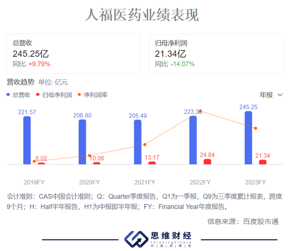 2023年,人福医药营业总收入245.25亿元,同比增长9.79%;归母净利润21.34亿元,同比下降14.07%。
