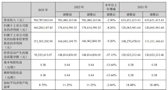 中国网财经4月26日讯 泰恩康上市次年业绩滑坡。日前,泰恩康发布2023年报。报告期内,公司实现营收7.61亿元,同比减少2.90%;实现归属于上市公司股东的净利润1.6亿元,同比减少8.26%;扣非净利润1.52亿元,同比下滑9.26%;经营活动产生的现金流量净额9352.56万元,同比下滑37.15%。
