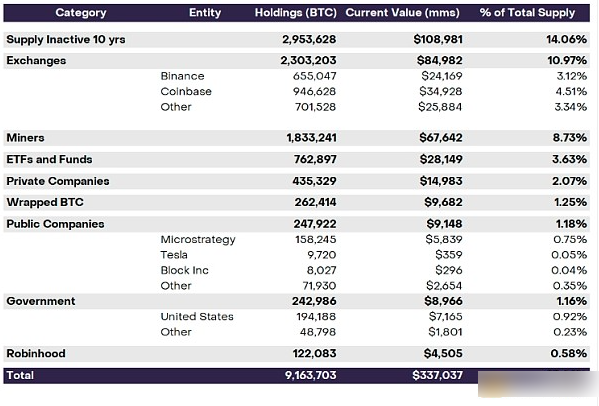 比特币的持有者包括从交易平台到上市公司再到主要政府的各种机构。尽管这些群体的一些成员可能与其他成员有重叠,但大约40%的比特币总供应可以归因于可识别的所有权群体,如交易平台、政府实体、上市公司和私人公司(例如,特斯拉和Block Inc.)、确保比特币网络安全的挖矿公司、ETF和其他上市基金、封装的比特币、消费者交易平台(例如,Robinhood)以及休眠地址。下面列举了这些群体。