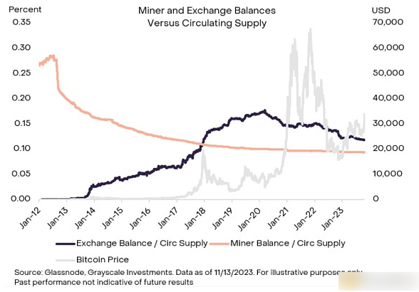 似乎表明相对不易变动的供应水平的其他所有权群体包括矿工和交易平台,它们占总供应的20%(分别约为9%和11%)。正如下图所示,尽管比特币价格随时间发生了相当大的变化,但这两个所有权群体在历史上一直相对不受价格弹性的影响。这可能是因为矿工随着时间的推移积累比特币作为奖励,通常只卖出需要支付运营成本的部分。在过去,矿工净流出的时期,例如2022年11月,对比特币整体矿工平衡的影响相对较小。这表明矿工整体比特币余额的很大一部分可能由长期持有者组成。短期内的某些程度的价格不弹性也可能延伸到其他所有权群体,例如封装的比特币(总供应的1.25%),这是由于比特币锁定在智能合约中。