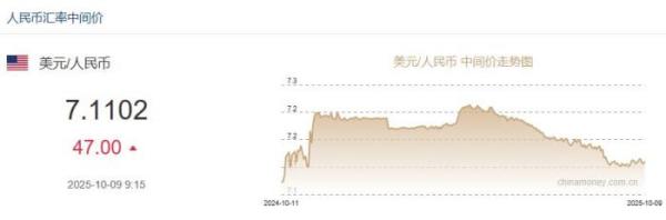 10月9日人民币对美元中间价报7.1102元 下调47个基点 更新时间:2025-10-09 11:24:31 •阅读 0 据中国外汇交易中心网站消息,中国人民银行授权中国外汇交易中心公布,2025年10月9日银行间外汇市场人民币汇率中间价为:1美元对人民币7.1102元,下调47个基点。 中国外汇交易中心网站截图