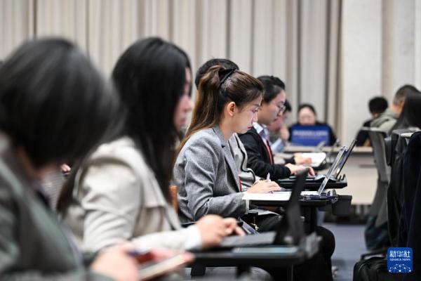 10月14日,国务院新闻办公室在北京举行“高质量完成‘十四五’规划”系列主题新闻发布会,国家发展改革委党组成员、国家粮食和物资储备局局长刘焕鑫,国家粮食和物资储备局副局长钱毅、副局长秦玉云介绍“十四五”时期粮食流通改革发展成效,并答记者问。这是记者在现场工作。新华社记者 陈晔华 摄