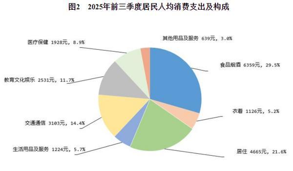 前三季度,全国居民人均食品烟酒消费支出6359元,增长2.5%,占人均消费支出的比重为29.5%;人均衣着消费支出1126元,增长1.6%,占人均消费支出的比重为5.2%;人均居住消费支出4665元,增长2.3%,占人均消费支出的比重为21.6%;人均生活用品及服务消费支出1224元,增长9.6%,占人均消费支出的比重为5.7%;人均交通通信消费支出3103元,增长8.3%,占人均消费支出的比重为14.4%;人均教育文化娱乐消费支出2531元,增长10.3%,占人均消费支出的比重为11.7%;人均医疗保健消费支出1928元,增长1.5%,占人均消费支出的比重为8.9%;人均其他用品及服务消费支出639元,增长10.3%,占人均消费支出的比重为3.0%。
