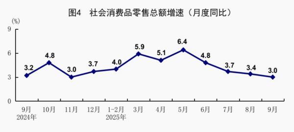 9月份,社会消费品零售总额增长3.0%,受中秋节错月节假日减少等因素影响,增速比8月份回落0.4个百分点;扣除价格因素,社会消费品零售总额实际增长3.5%。值得注意的是,社零总额同比增速已连续4个月回落。