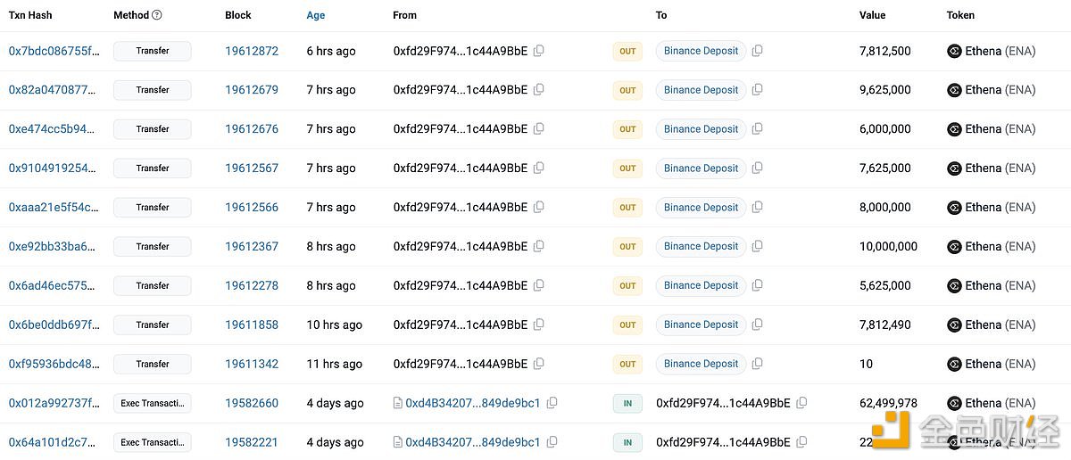 该钱包4天前从Ethena团队的Gnosis Safe Proxy钱包收到了6250万枚ENA(8375万美元)。