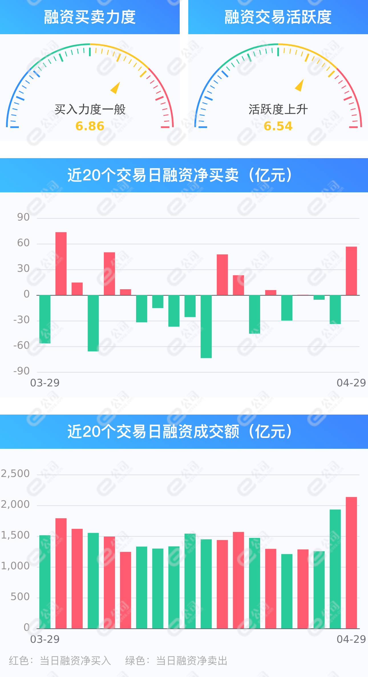 截至4月29日,上交所融资余额报7873.27亿元,较前一交易日增加34.61亿元;深交所融资余额报6991.05亿元,较前一交易日增加21.89亿元;两市合计14864.32亿元,较前一交易日增加56.50亿元,融资交易额2132.57亿元,占A股成交额17.61%,其中融资买入额1094.54亿元,融资偿还额1038.04亿元,交易活跃度上升10.53%。