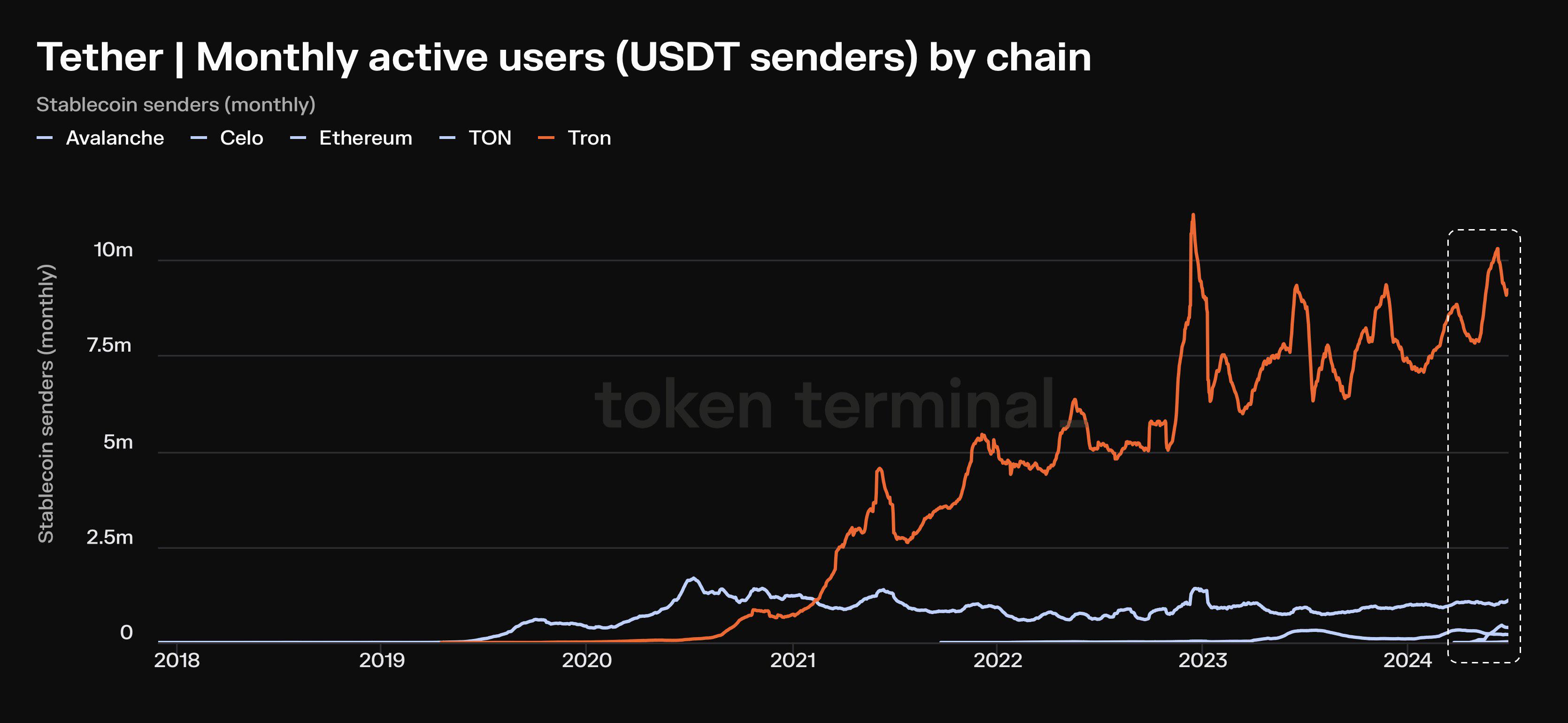 6月29日消息,据Token Terminal数据,Tether 的 USDT 每月有 1090 万活跃用户(MAU),其中 84.3%(920 万)的月活跃用户来自 Tron。