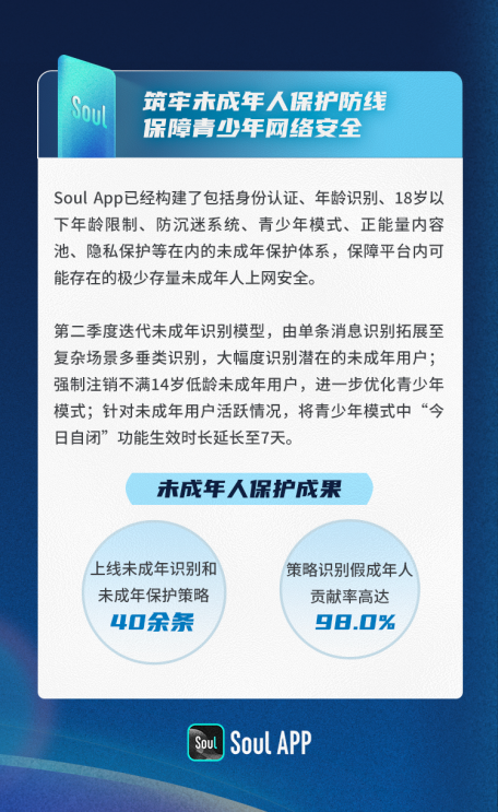 Soul App始终把未成年人网络安全作为重中之重,不断完善身份认证、防沉迷、隐私保护等措施,构建了全面的未成年人网络保护体系。