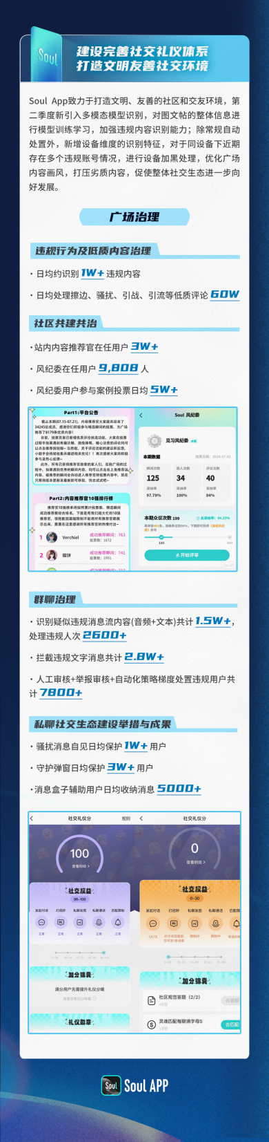 第二季度中,Soul在违规行为和低质内容的治理、社区的共同建设和治理、群聊管理以及私聊社交生态的构建等方面持续发力,不断完善社交礼仪体系,致力于打造一个积极健康的社区环境,确保用户在无压力的氛围中享受社交乐趣。