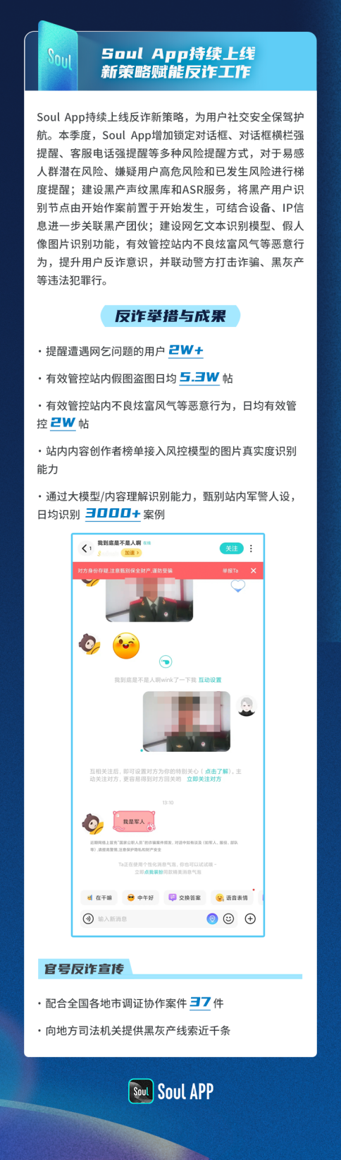 此外,Soul还积极与全国各地的执法机构合作,协助调查了37起案件,并向司法机关提供了近千条涉及黑灰产业链的线索,为从根本上打击网络犯罪活动做出积极贡献。
