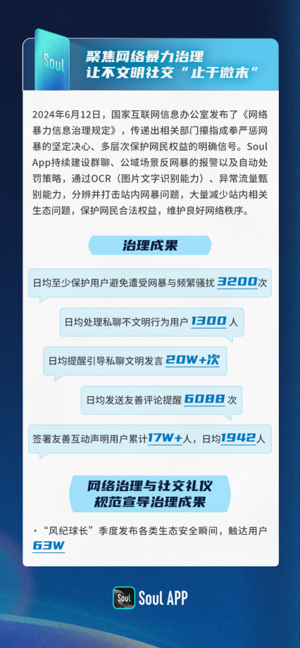 此外,Soul的官方"风纪球长"在本季度发布了多条关于生态安全的重要信息,信息触达63万用户,进一步强化了Soul对网络文明的承诺和对用户安全的保障。