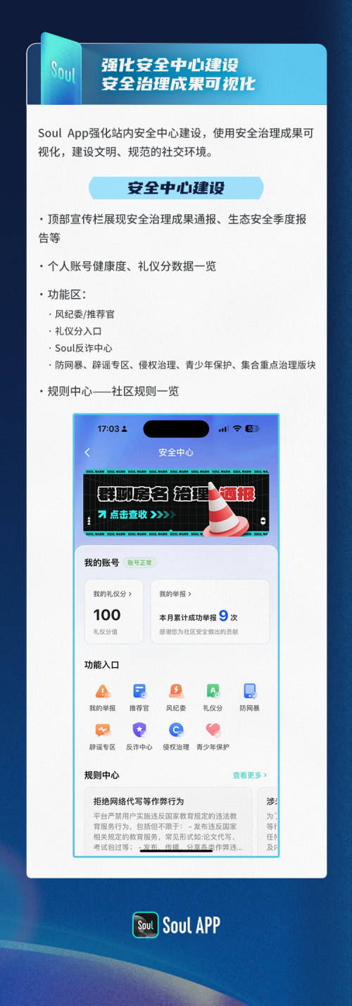 期间,Soul 持续上线反诈新策略,前置拦截高危风险;建设完善社交礼仪体系,加强对违规内容识别能力;聚焦网络暴力治理,分辨打击站内网暴问题;筑牢未成年人保护防线,完善相关保护体系。