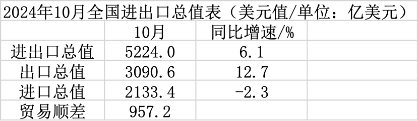海关总署11月7日公布10月外贸数据,以美元计,10月中国进出口总值5224.0亿美元,同比增长6.1%;出口总值3090.6亿美元,同比增长12.7%;进口总值2133.4亿美元,同比下降2.3%;贸易顺差957.2亿美元。