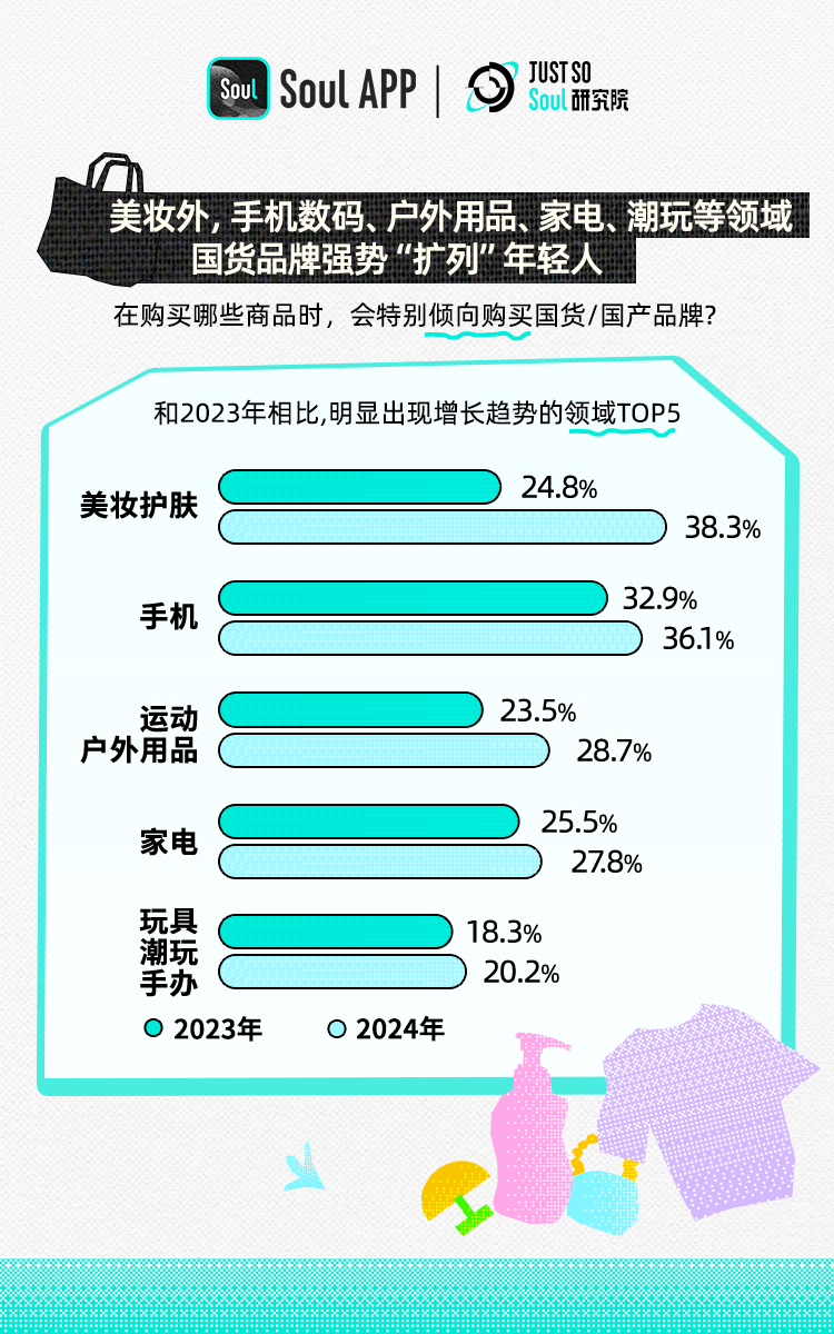 在品牌倾向上,2024年,有近6成年轻人选择购买国货。尤其是在美妆护肤、手机、运动/户外用品、家电、玩具/潮玩/手办上,年轻人对国货品牌的喜爱度进一步提升——这也是和2023年相比明显出现增长趋势的领域TOP5。
