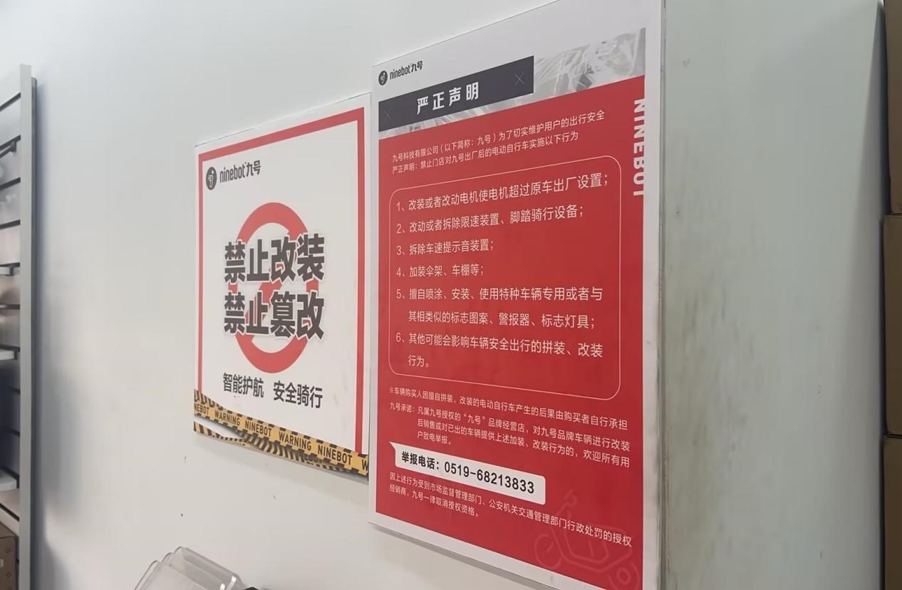 在线下门店管理方面,包括长沙地区在内的九号所有线下门店的显眼位置,均标志有“禁止改装、禁止篡改”的提示。小邹带领的市场团队也会反复和代理商、门店强调,不能私自改动车辆的出厂状态。为了引起代理商、门店工作人员对“非法改装”一事的重视,小邹还经常给他们分享各地因非法改装电动两轮车而引发的安全事故。