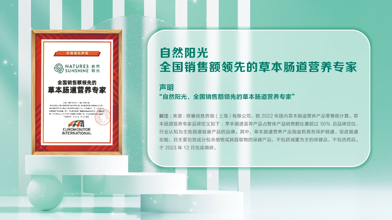 自然阳光喜迎重磅好消息,国际权威调研机构欧睿信息咨询(上海有限公司发出声明,对自然阳光“全国销售额领先的草本肠道营养专家”称号和市场地位予以认证。自2014年进入中国市场以来,自然阳光就明确了“产品为王”的核心战略,紧紧围绕“基于肠道微生态的代谢管理”理念,深耕草本肠道营养健康,着力打磨“产品”这把“利剑”,通过近十年时间的反复锤炼,成功突围营养补充剂市场,领跑行业高端赛道,得到了消费市场与权威机构的双重认可。