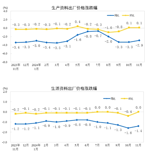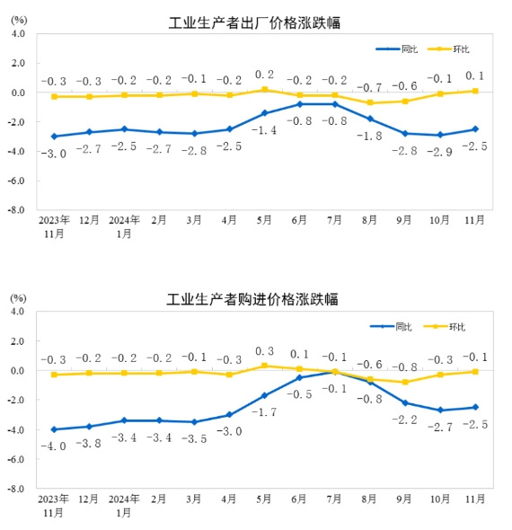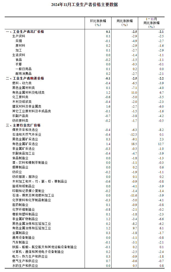 财经12月9日讯 国家统计局网站9日公布工业生产者价格指数月度报告。2024年11月份,全国工业生产者出厂价格同比下降2.5%,降幅比上月收窄0.4个百分点,环比由上月下降0.1%转为上涨0.1%;工业生产者购进价格同比下降2.5%,环比下降0.1%。1—11月平均,工业生产者出厂价格比上年同期下降2.1%,工业生产者购进价格下降2.2%。