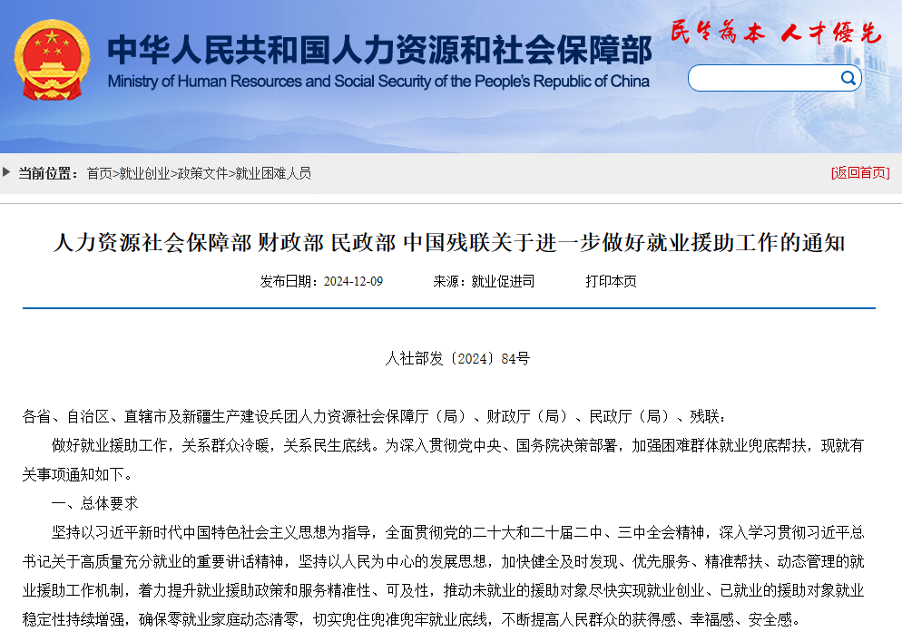 财经12月9日讯 据人力资源社会保障部网站消息,人力资源社会保障部、财政部、民政部和中国残联联合印发关于进一步做好就业援助工作的通知。其中提到,加快健全及时发现、优先服务、精准帮扶、动态管理的就业援助工作机制,着力提升就业援助政策和服务精准性、可及性,推动未就业的援助对象尽快实现就业创业、已就业的援助对象就业稳定性持续增强,确保零就业家庭动态清零,切实兜住兜准兜牢就业底线,不断提高人民群众的获得感、幸福感、安全感。