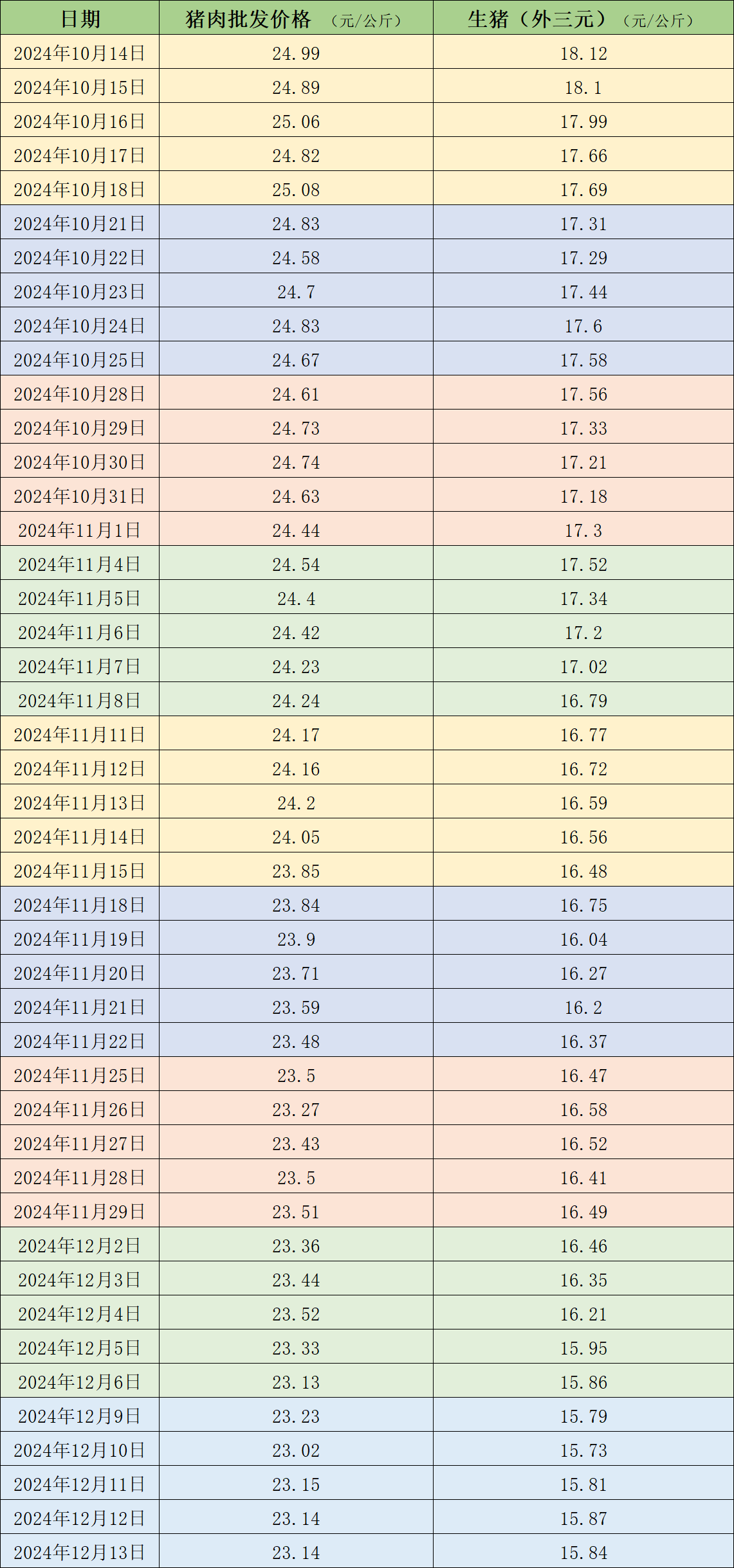 据农业农村部监测,12月13日,全国农产品批发市场猪肉平均价格为23.14元/公斤,与上周五(12月6日的23.13元/公斤相比,基本持平。本周的平均价格为23.14元/公斤,与上周23.36元/公斤的均价相比,下降0.9%。