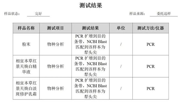 为了核实这一情况,网易财经将相宜本草的部分产品送检专业机构,检测结果证实,这些产品内确实含有“犁头尖”成分基因片段。然而,相宜本草并未将这一成分在药监局进行注册或备案,也未在产品的成分表中如实披露。