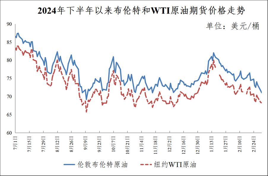 调价周期内,供应增长和需求低迷预期影响国际油价震荡下降。以布伦特原油期货为例,价格从每桶76美元降至71美元,为近半年来低位。供应方面,根据美国能源信息署最新披露数据,美国原油产量已增至创纪录的1350万桶/日;美国贝克休斯能源服务公司数据显示,美国石油和天然气钻机数量连续五周增加,截至2月28日达到593个,意味着后期产量将继续增长。“OPEC ”产油国近期再次重申将按计划从4月份开始提高原油产量,这是其自2022年以来首次增产。需求方面,美国开始对加拿大和墨西哥等国加征关税,市场对由此可能导致的经济低迷和需求下滑产生担忧。此外,乌克兰和俄罗斯仍有可能达成和平协议也影响油价走低。