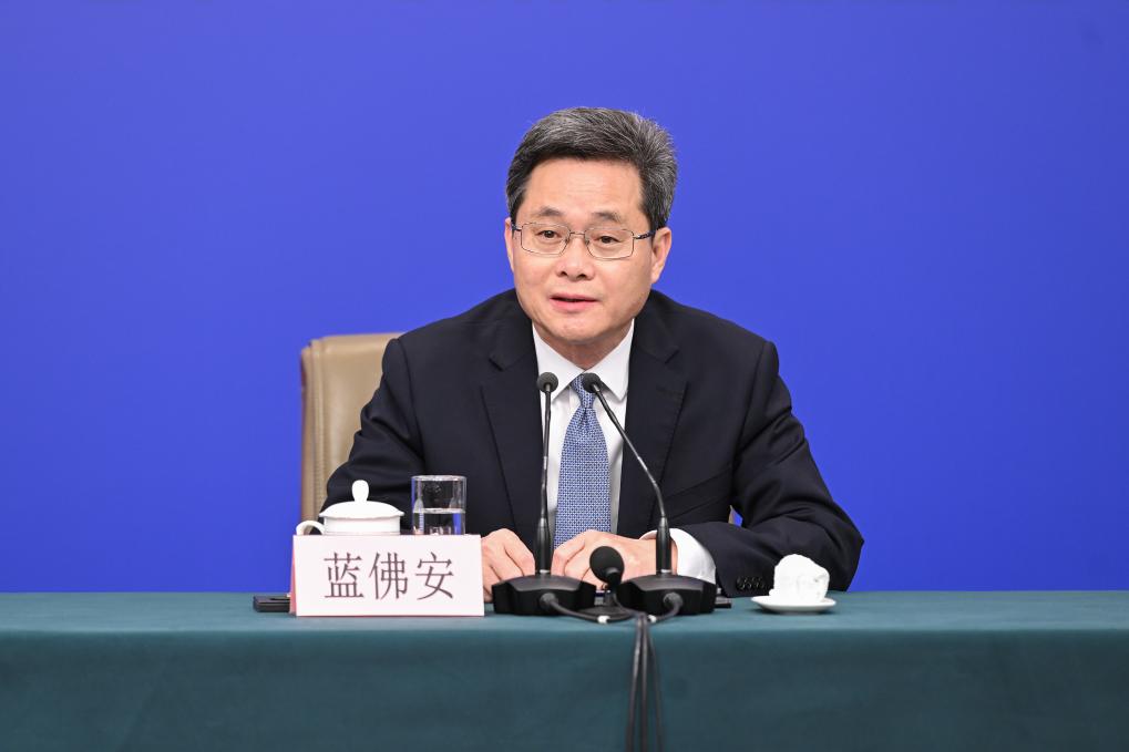 这是蓝佛安在回答记者提问。新华社记者 胥冰洁 摄