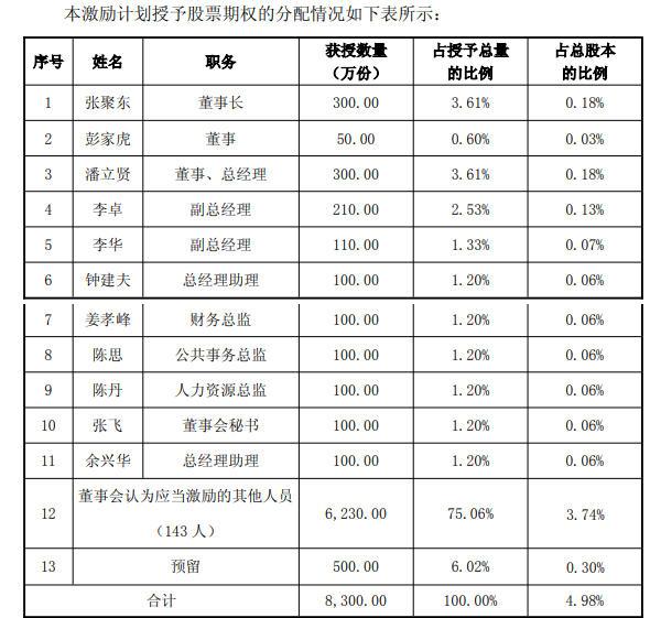 根据公告,此次激励计划授予股票期权总额不超过8300万份,占本激励计划公告时公司股本总额的 4.98%。其中董事长张聚东获授300万份,董事、总经理潘立贤也获授300万份。