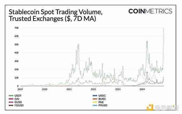 - 除了作为价值存储手段之外,稳定币在牛市中还是至关重要的交易媒介。大选后,各大交易所的稳定币交易量飙升至 1200 亿美元,交易量最大的交易对包括 BTC、ETH、SOL 和 memecoins。