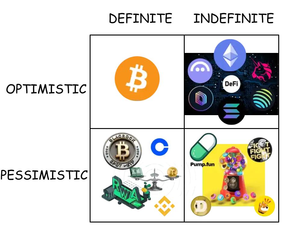 透过蒂尔的视角,我看到加密世界的时间线如同一次演进:从比特币早期的「确定性乐观」,到 Web3 宏大愿景下的「非确定性乐观」——金融最终被视为杀手级应用;再到 meme 币赌场时代的「非确定性悲观」;而如今,在监管趋于明确的当下,我们似乎正战略性地接受一种「确定性悲观」。
