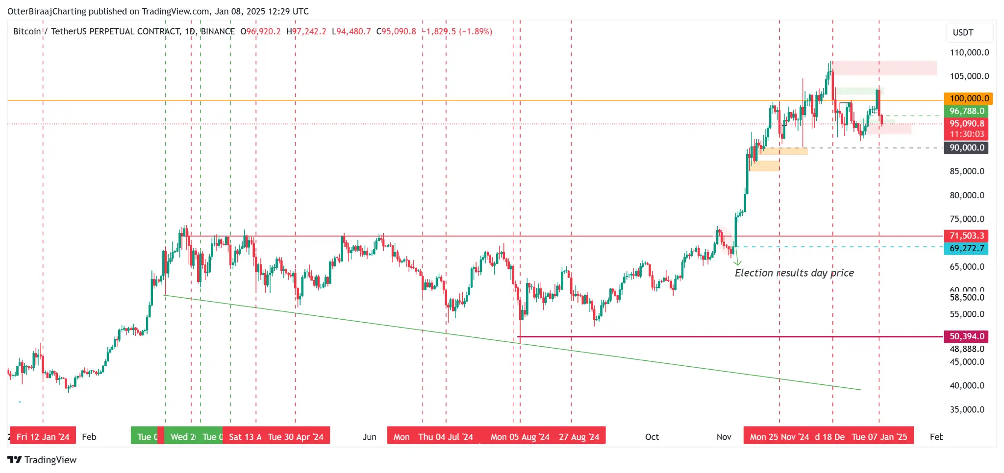 比特币(BTC)价格在1月8日遭遇滑铁卢,日线图上出现看跌吞没形态,创下近19周以来第二大单日跌幅。 市场波动加剧,分析师们对BTC价格可能跌破9万美元的可能性展开了热烈讨论。