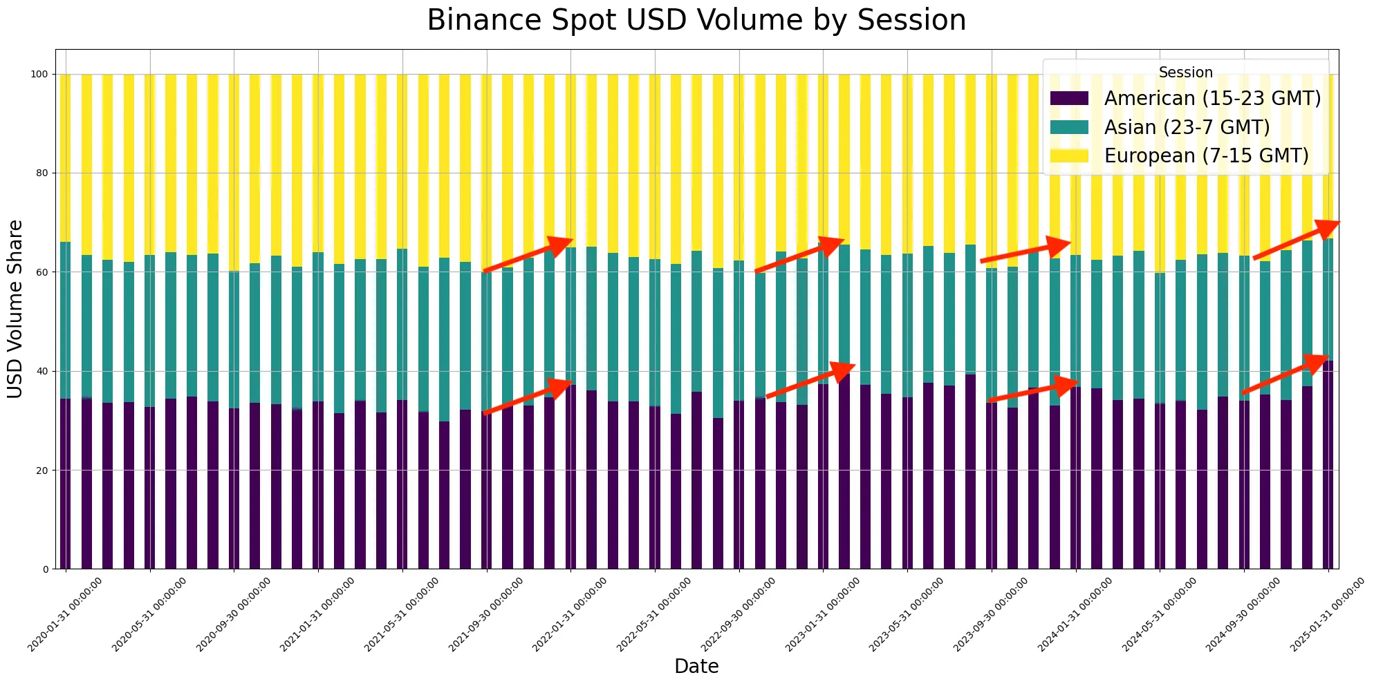市场分析师Jamie Coutts也持乐观态度,认为增加的流动性可能推动BTC价格在六个月后上涨。他认为,美元走强本应导致比特币跌至8万美元,但强劲的买盘表明市场预期依然积极。 与以往牛市相比,当前牛市流动性更强,数据分析师Roman Zinovyev指出,自2020年以来,币安现货市场的美元交易量持续增长,2024-2025年美洲市场份额更是创下42%的历史新高。