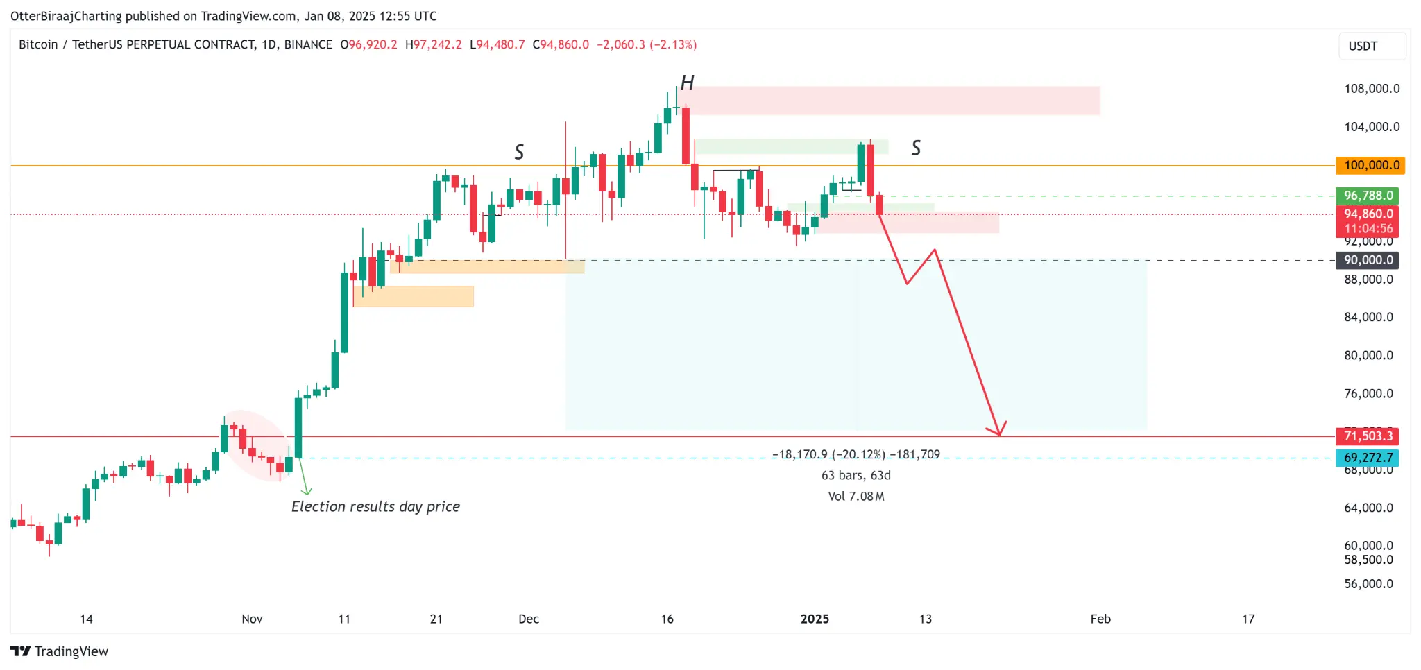 如果日线收盘跌破90,000美元,可能引发更大幅度的下跌,确认反转头部形态,导致BTC价格进一步下跌20%,目标价位为71,500美元。