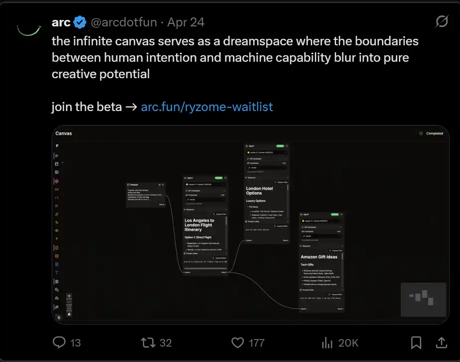 此外,他们还将推出一个「Ryzome Canvas」的无代码/节点式 Agent 构建工具,用户可以接入通用的 MCP 服务端资源,以及 Arc 合作伙伴提供的服务与用例,自定义创建代理工作流(类似 Rayon Labs 的 Squad 工具)。