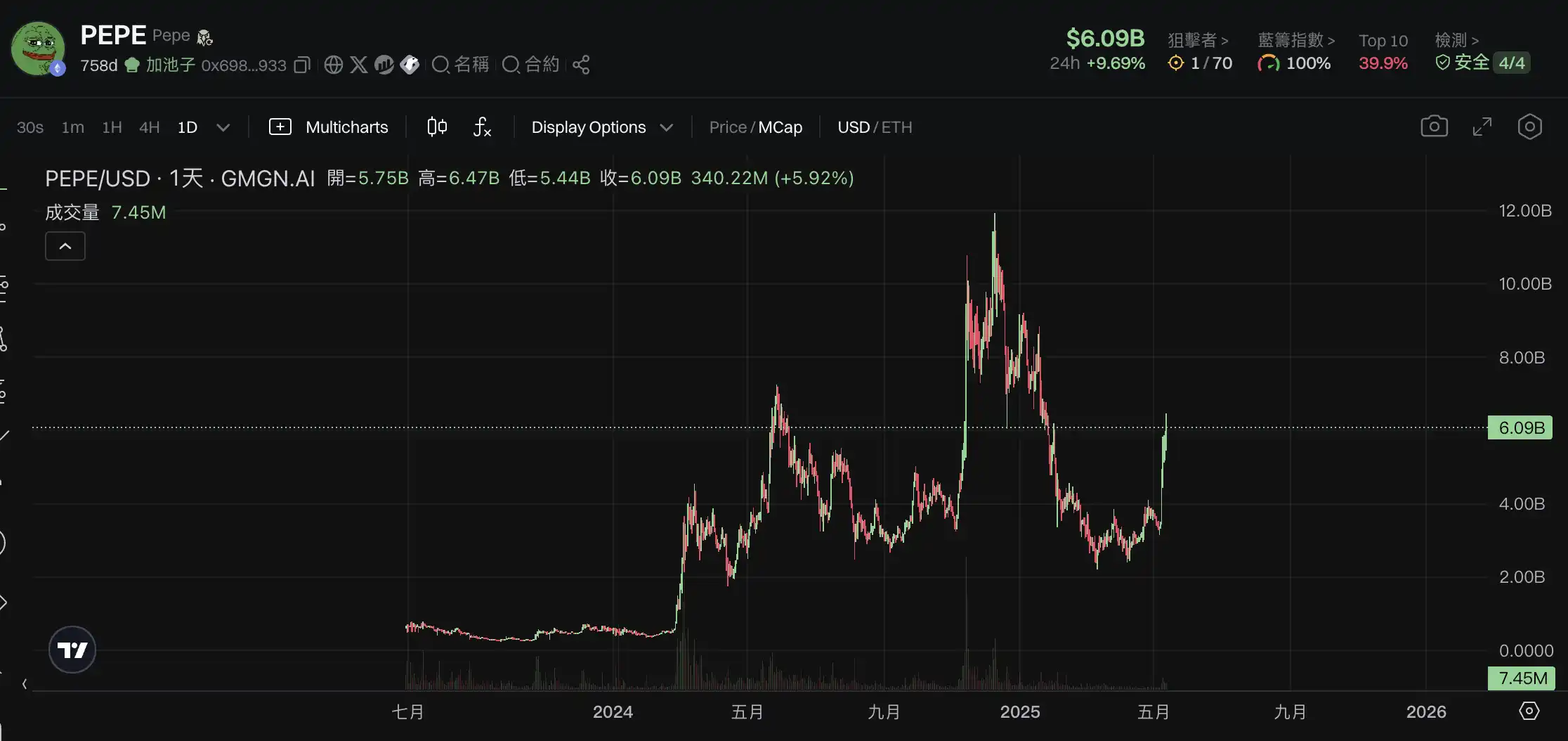 FROGGER 于 12 天前创立,在横盘两周后于昨日突然暴涨 10 倍,榜一当前是打给 Vitalik 的 15% 的代币,目前该代币最高达到 280 万美元市值,现已回调到 200 万美元。虽然为青蛙新概念,但不知道叙事在当下市场中是否有延续性。