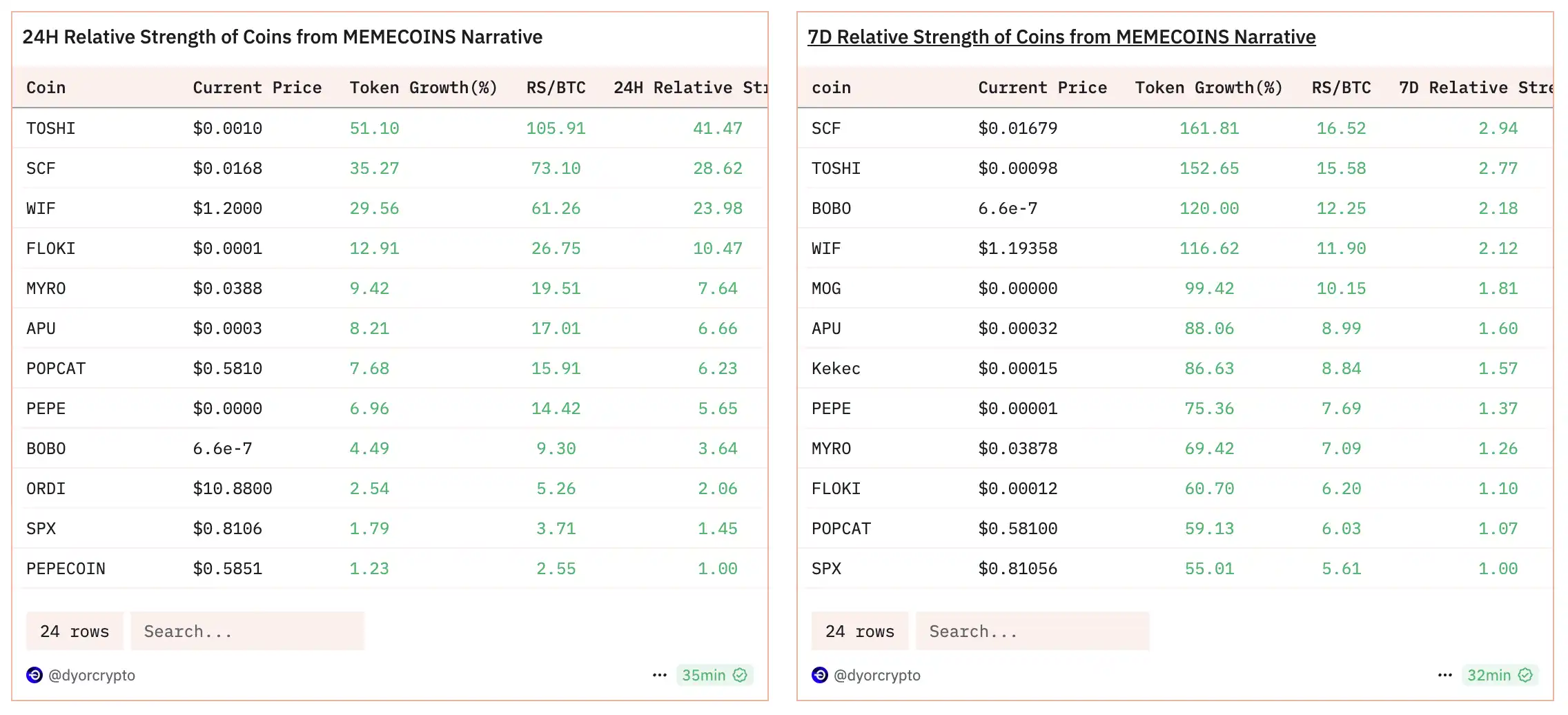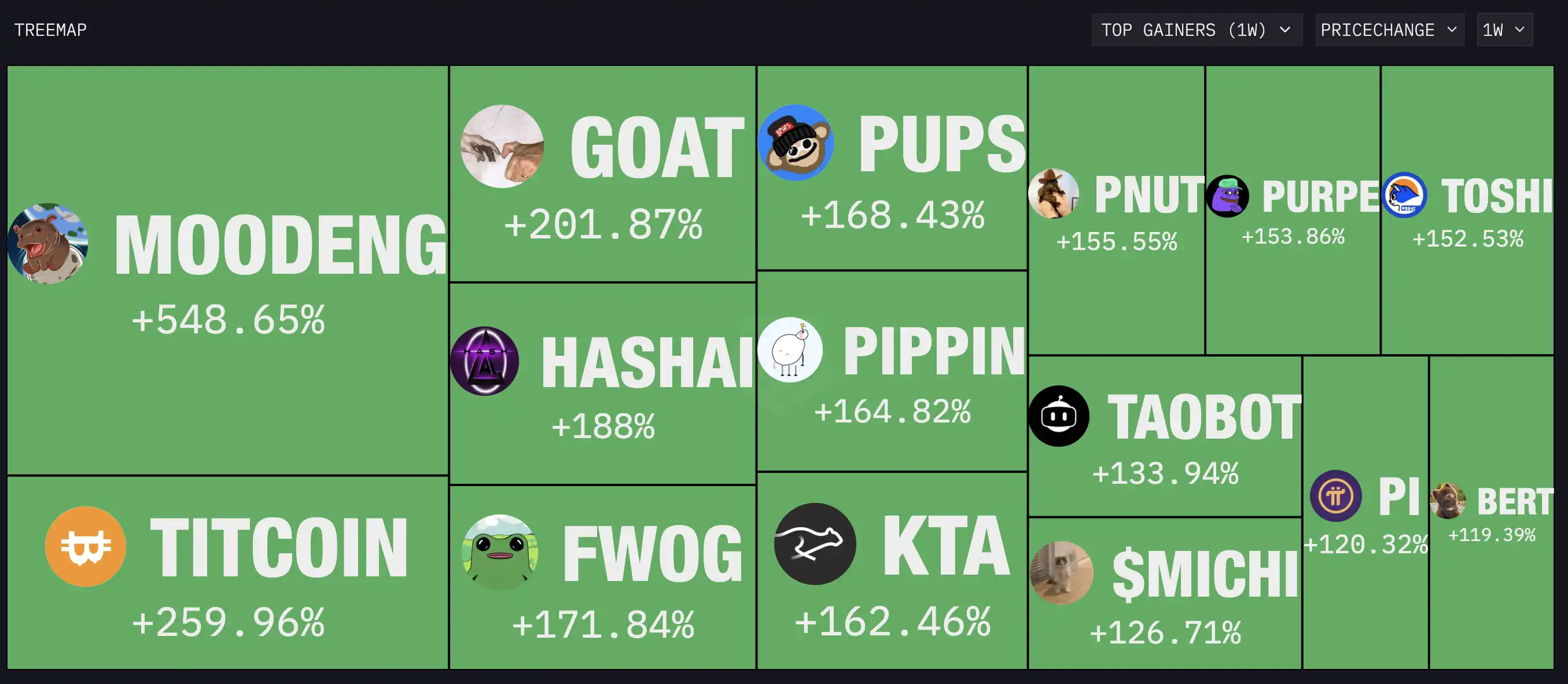 按照 ARKHAM 的 TREEMAP 数据显示,最近一周表现最好前 15 个代币中有一半都是 Solana 的老 Memecoin,其中当属 MoonDeng 与 PNUT 概念最火,知名 KOL 川沐对他购买这两个代币的逻辑是「他们很像早期的 pepe 和 shib」,而无论如何这两个同时期的概念币都在这个周期中表现出色。
