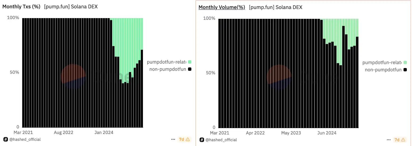 当链上行情回暖时,玩家们还是会将 Solana 作为第一动力点,近一个月的 Solana 活跃地址数飙升,虽然能够赚到钱的玩家越来越少,但交易量与流动性与 ETH 的 Meme 相比高出了一个数量级。在一级市场方面,Solana 已经苦 PumpFun 久矣,但在如今市场以 BONKFUN 为首的 Raydium 系 LaunchPad 对其发起的总攻似乎起了效果,非 Pumpfun 平台的交易量以及交易 Txs 都达到了去年同期的水平。