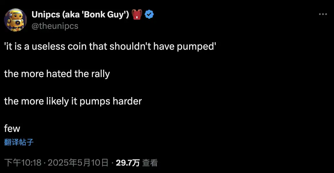 USELESS 来自 BONKGUY 在 X 上发布的一则推文「这是一种无用的货币,不应该被推高」,这种类似于「FARTCOIN」、「SHIT」、「HOUSECOIN」等虚无情绪化概念是欧美社区的钟爱,而自 BONK 发射之后市值一路狂飙至 3400 万美元也让人仿佛看到了「HOUSECOIN」同样的路径。