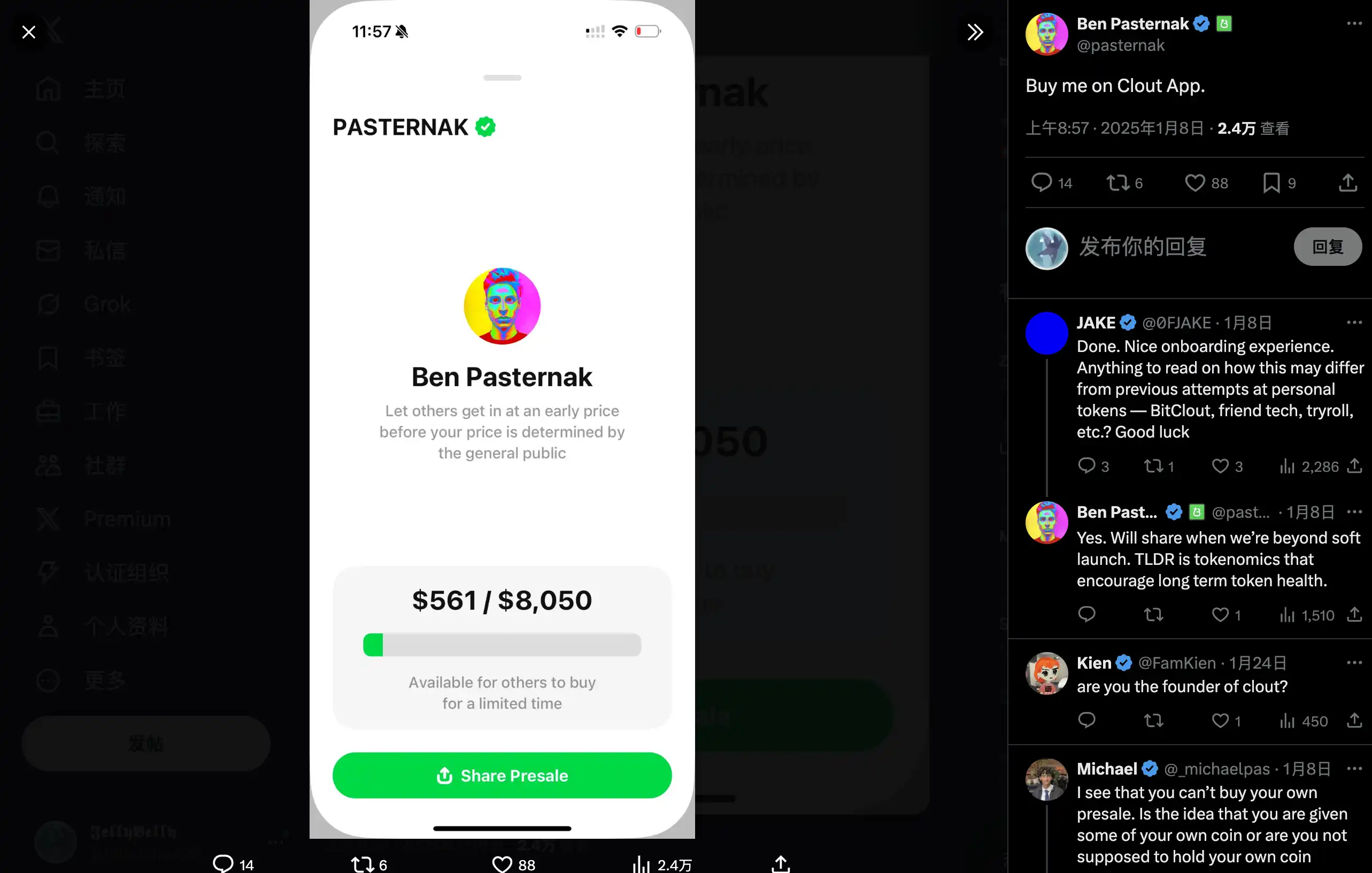 2025 年 1 月 8 日,Ben Pasternak 这位 25 岁的澳大利亚年轻创业者在社交媒体 X 上发布了一则推文「Buy me on Clout APP」,那时还没有太多 Crypto 圈的人认识他,而两周后的 1 月 24 日,该代币满足 Clout 平台筹资的条件达到 100% 成为该平台发射的第一个代币,并一举冲到了 8000 万美元市值。