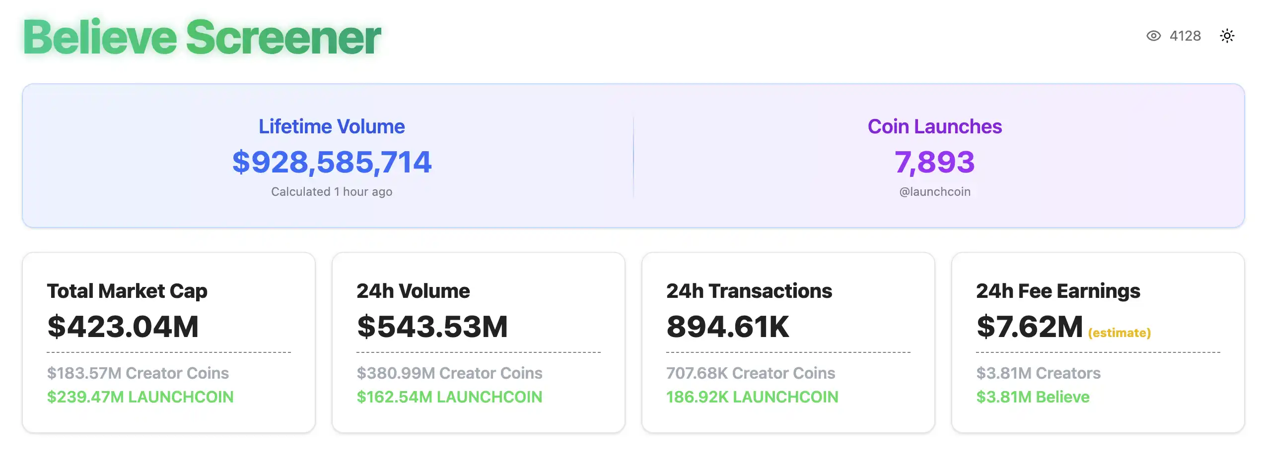 自 4 月 27 日上线以来,Believe 展现出了强大的市场爆发力。不仅得到了 Solana 生态主流项目和创始人的关注,收入方面也十分可观。据 Believescreener 数据,Believe 平台过去 24 小时收入预估达 762 万美元,其中创作者收入达 381 万美元。