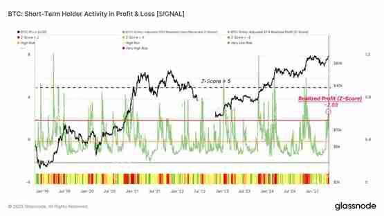 与此同时,Glassnode最新周报指出,短期持有者(STH)在近周出现已实现利润的明显上升。STH的已实现利润值目前已达其90日平均值的 3个标准差,反映市场上短期获利了结行为升温。